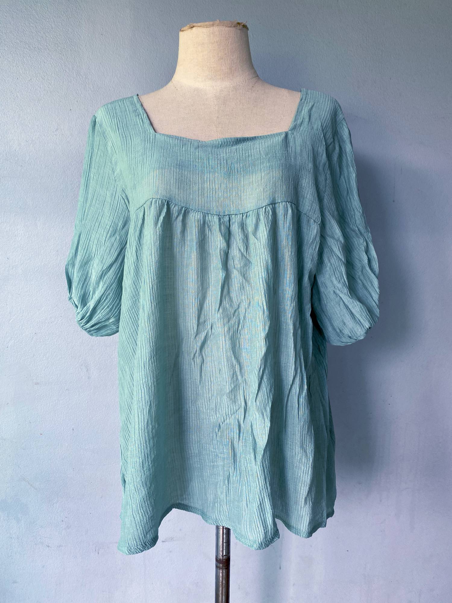 ふんわりとしたボリューム袖と、スクエアネックの女性らしいデザインがポイント。