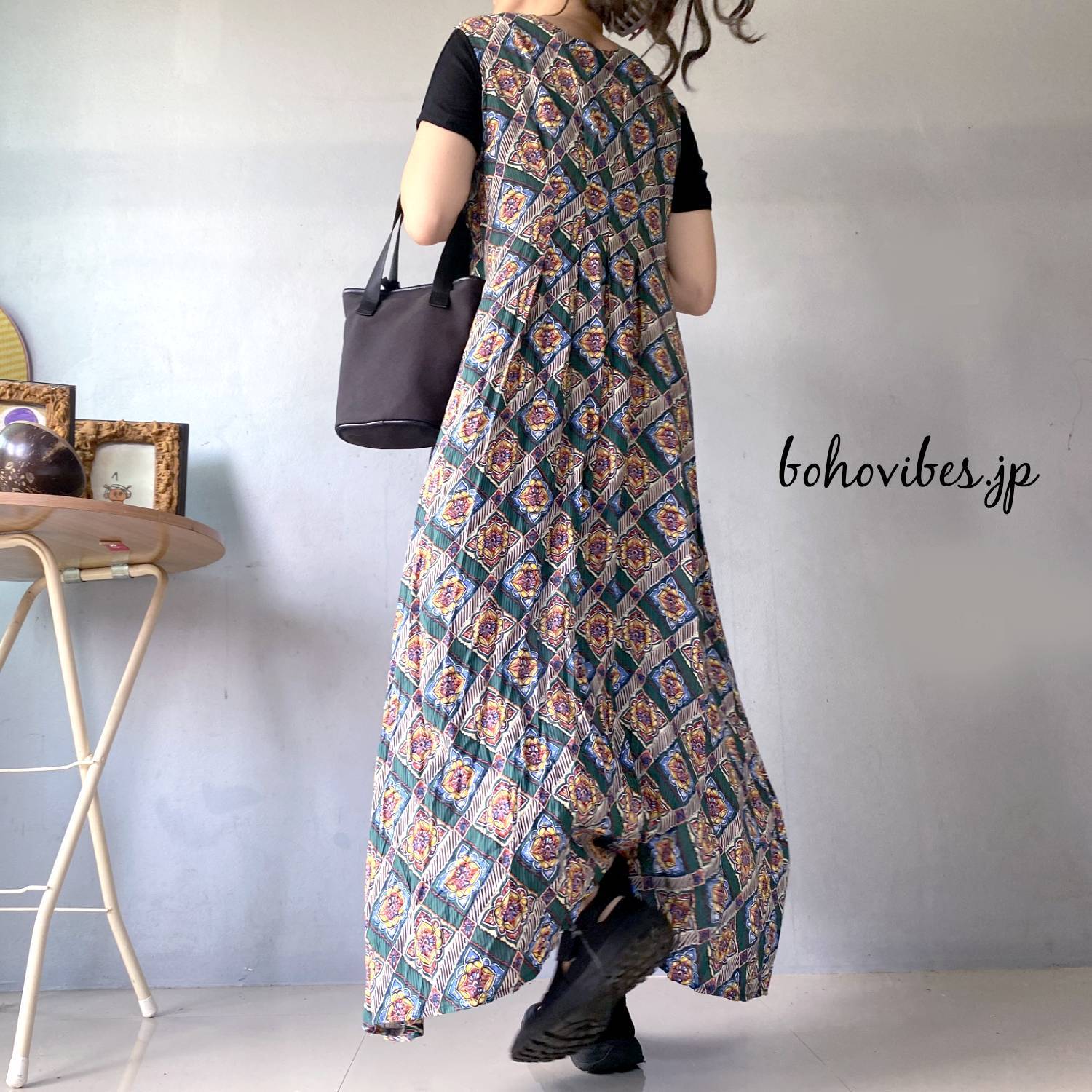 エスニック調アラベスク柄 フロントオープン ノースリーブワンピース