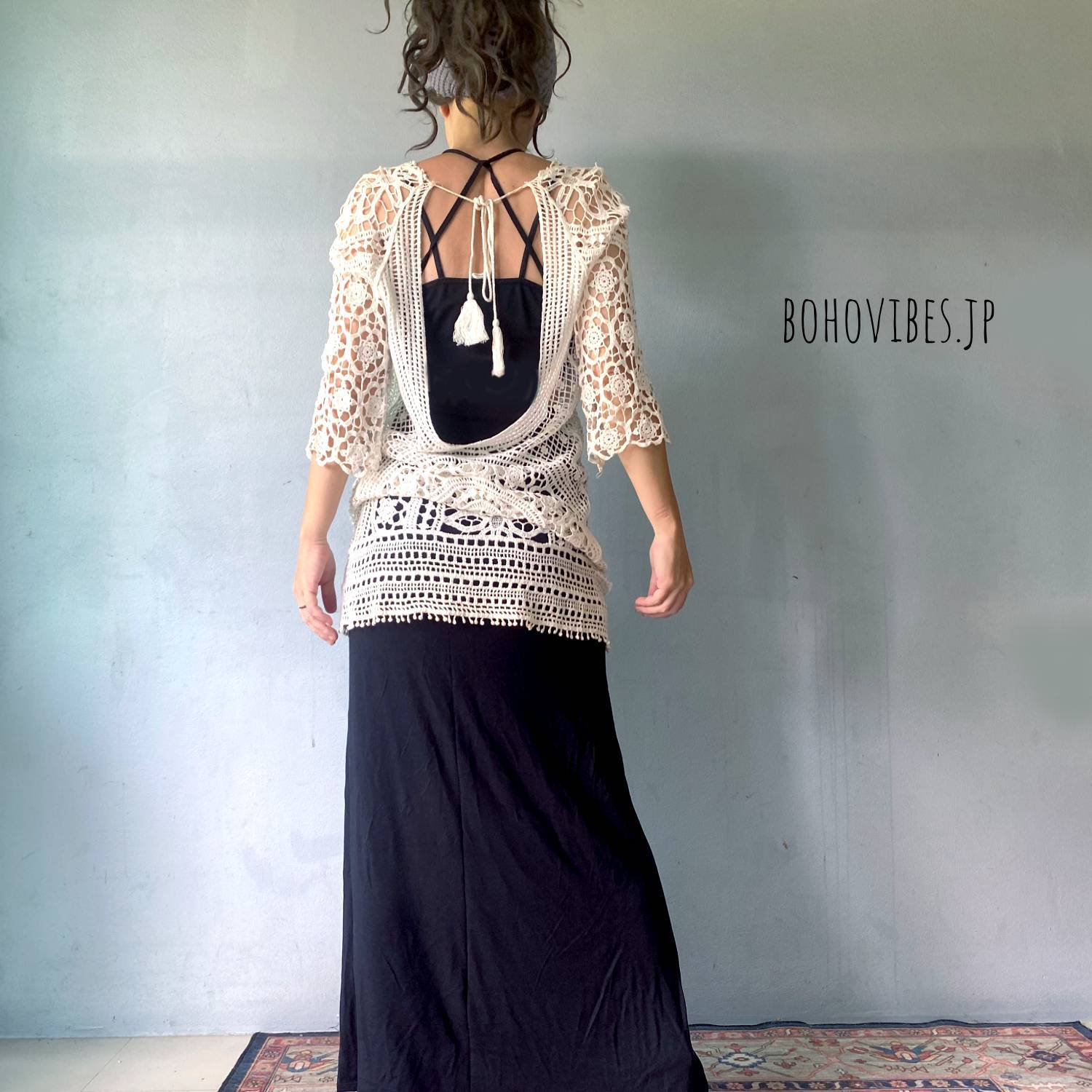 **かぎ針編み クロシェ ボヘミアン 背中開き 8分袖 ワンピース**