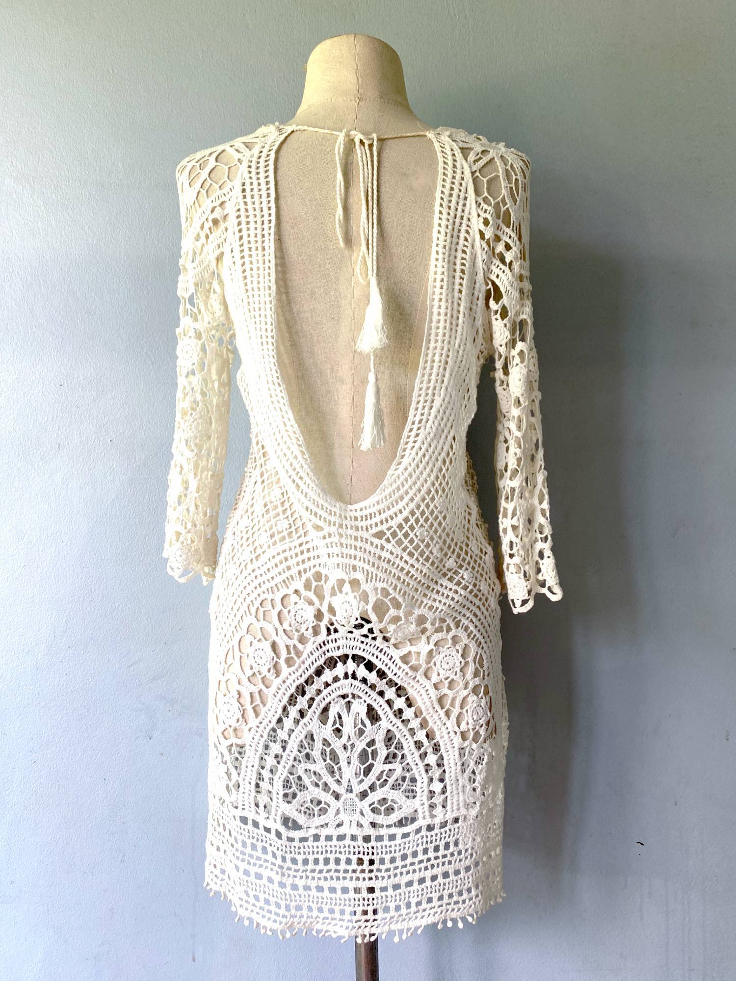 魅力的なかぎ針編みデザインが施された、ボヘミアンスタイルの背中空きワンピースが新登場です!ユニークなクロシェ素材による風合いが特徴で、個性的なファッションを楽しめる一着です。