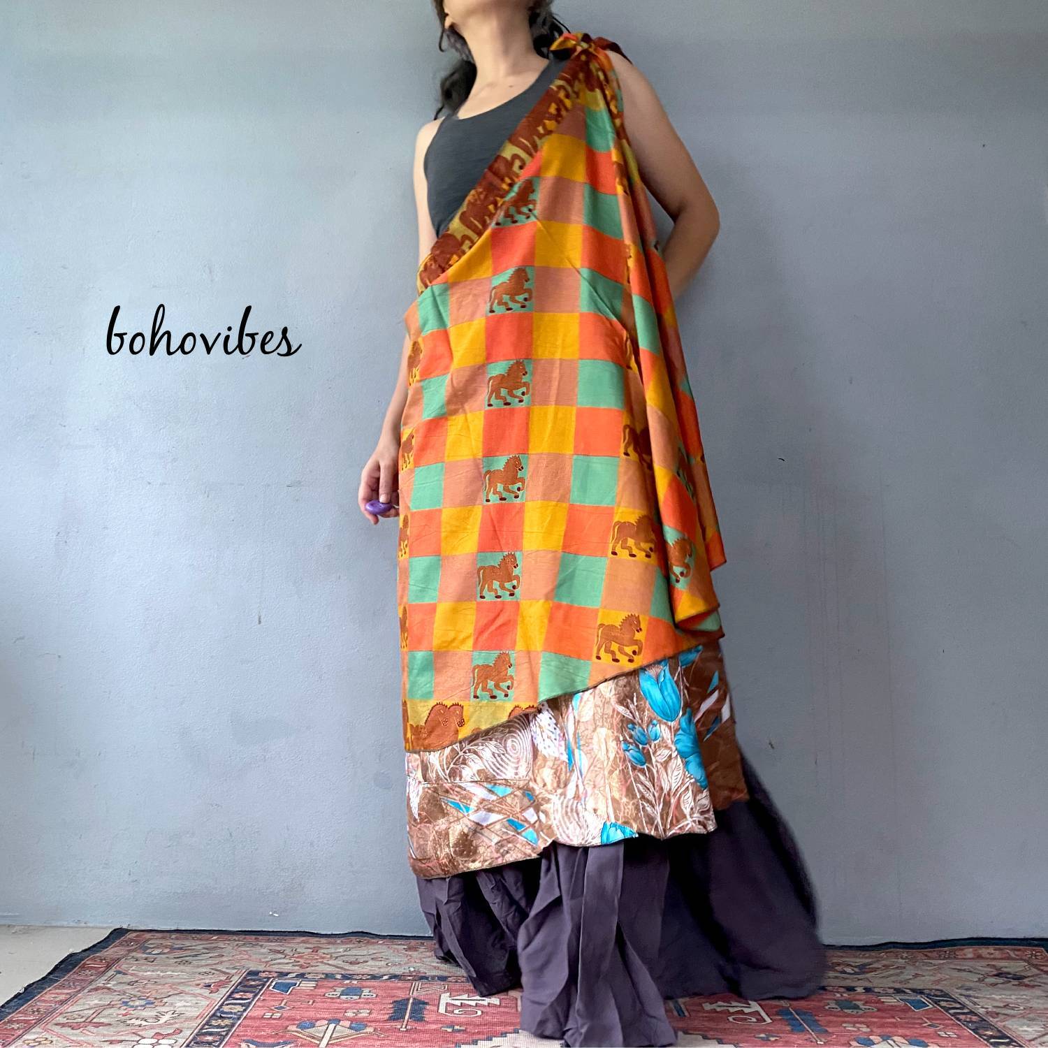この巻きスカートは、サリーの魅力を活かしつつ、簡単に着脱ができるデザイン。巻き方次第ではワンピースやジレとしても活用できるので、コーディネートの幅が広がります。様々なシーンで活躍し、あなたのスタイルを引き立てます。