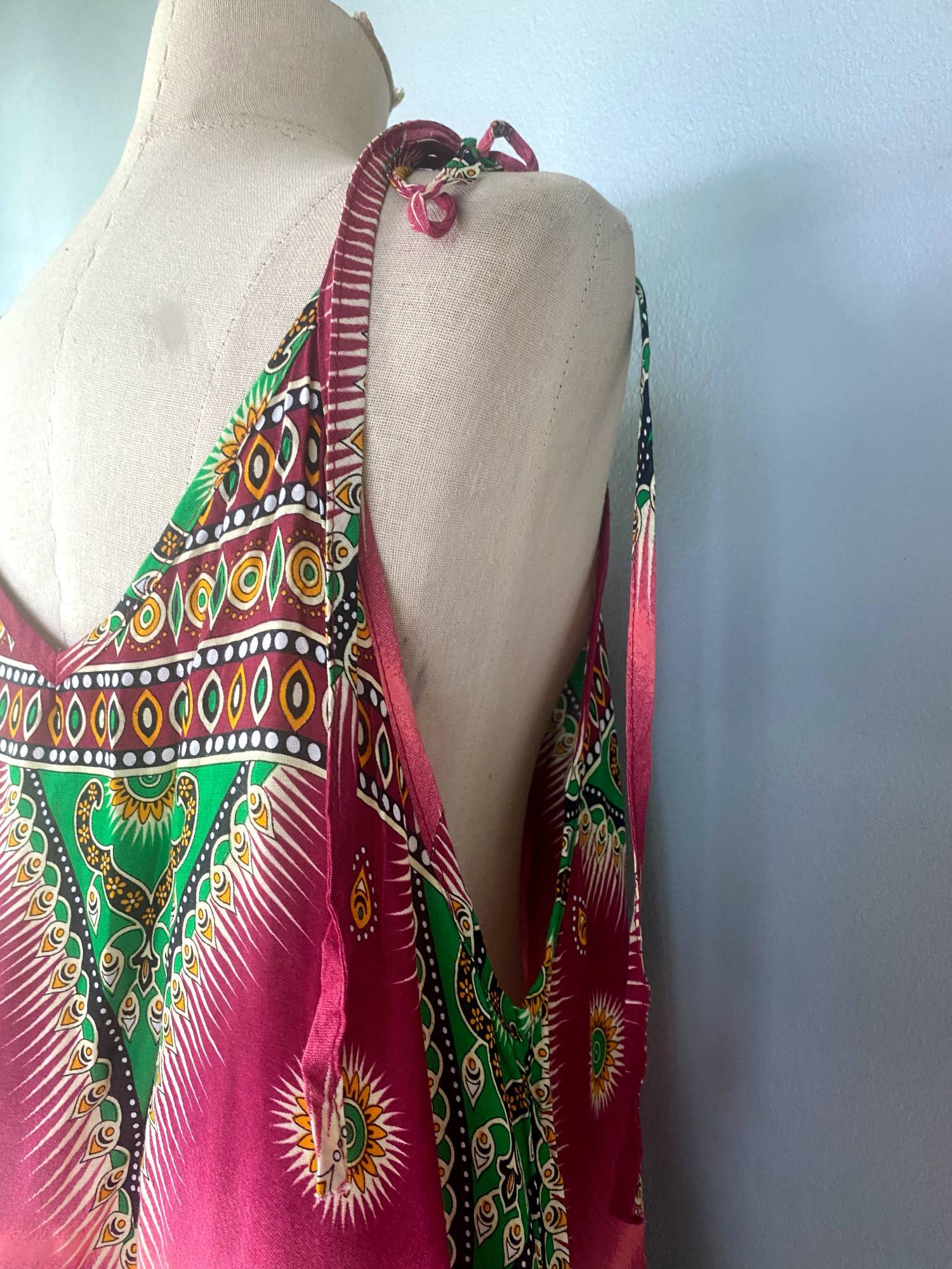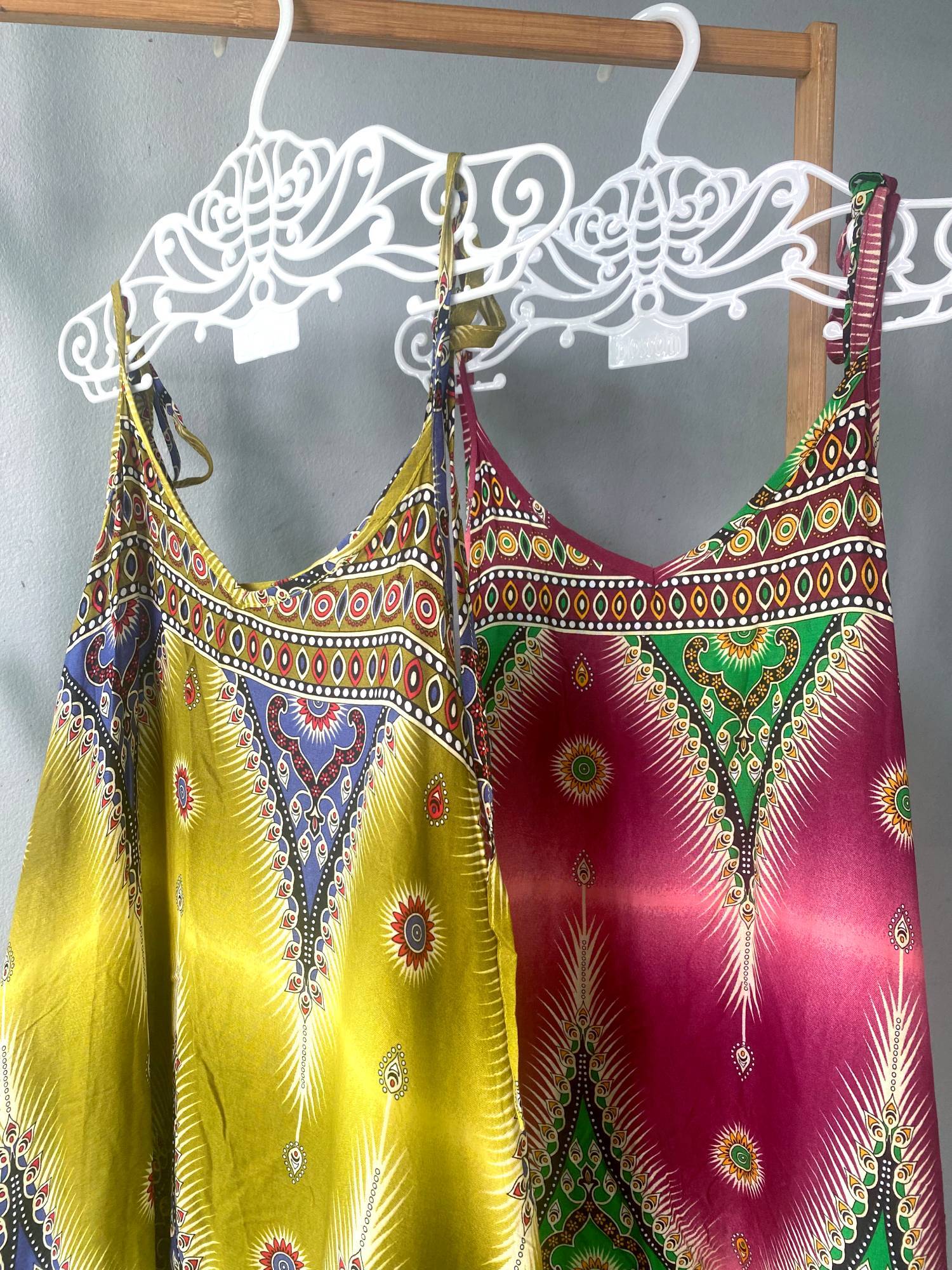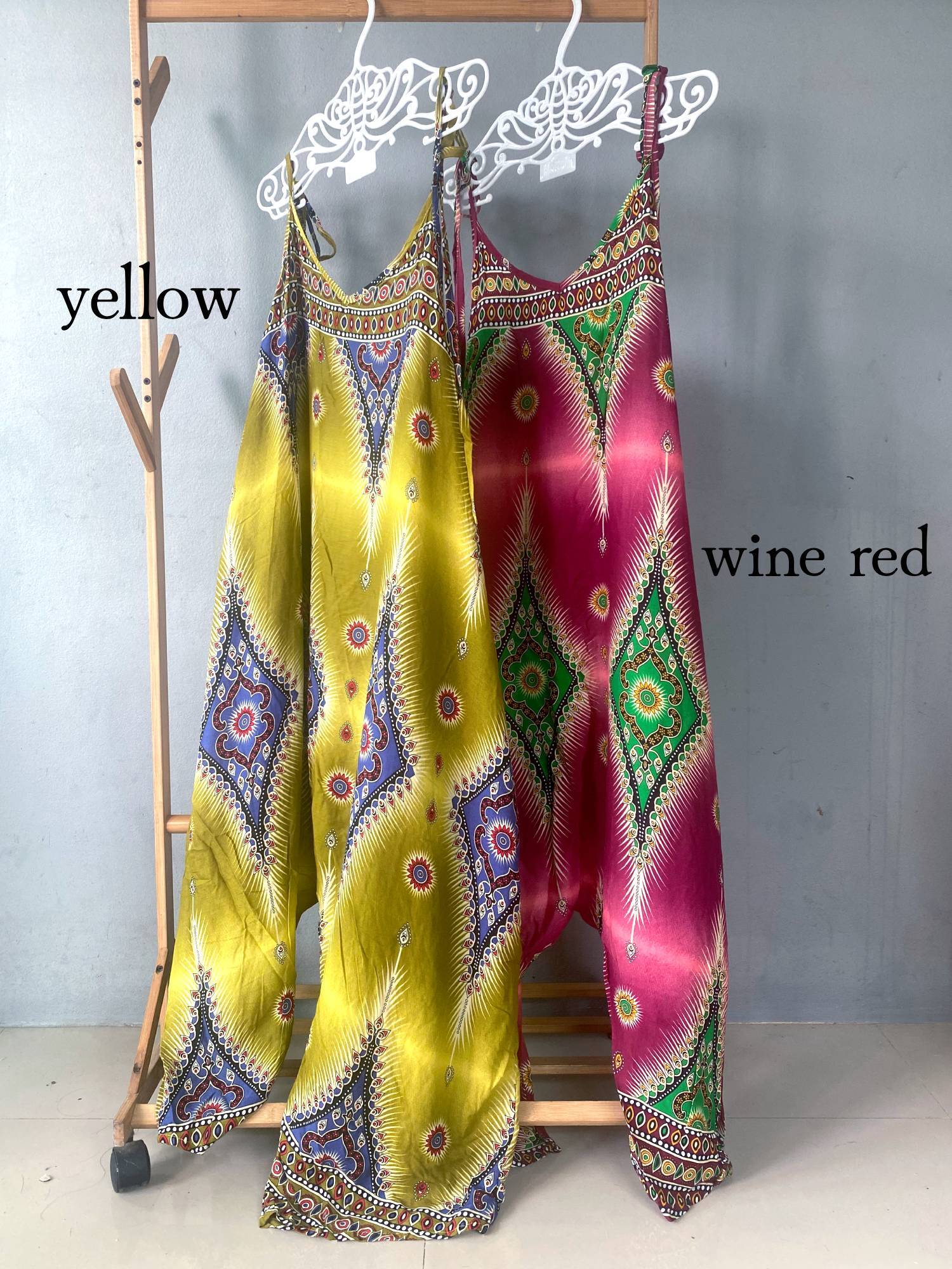 **【yellow / wine red】エスニックサイケ柄さらさらレーヨン ふっくらサロペット**