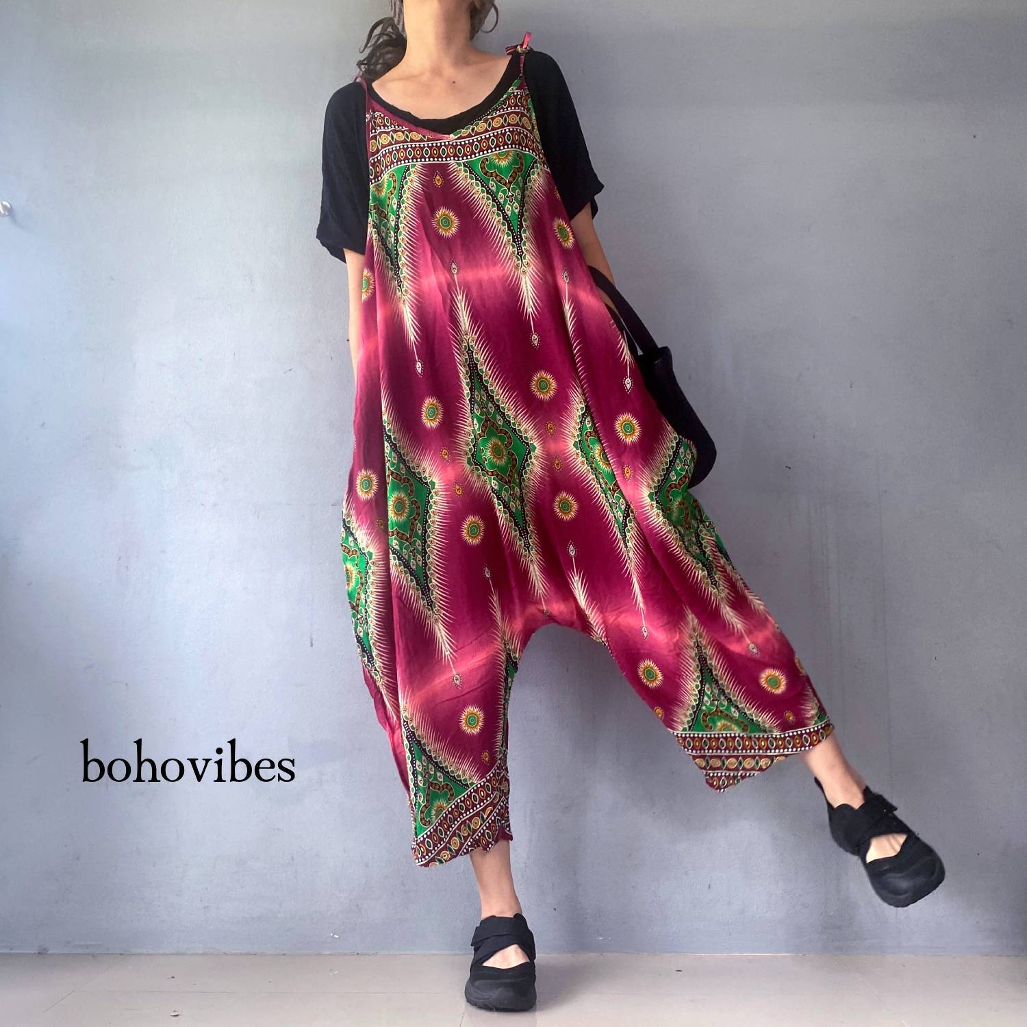 個性的なカラーとデザインが魅力のエスニックサイケ柄さらさらレーヨンふっくらサロペットが登場しました!ふっくらしたシルエットとたっぷりとした股下が愛らしく、長めの肩ひもが揺れる姿は、どこかリラックスした雰囲気を演出します。