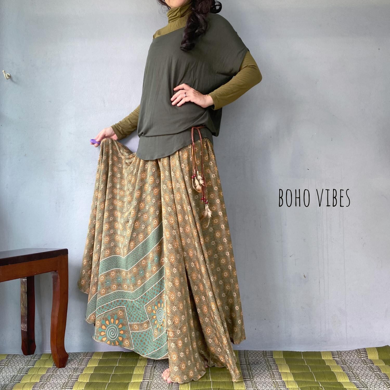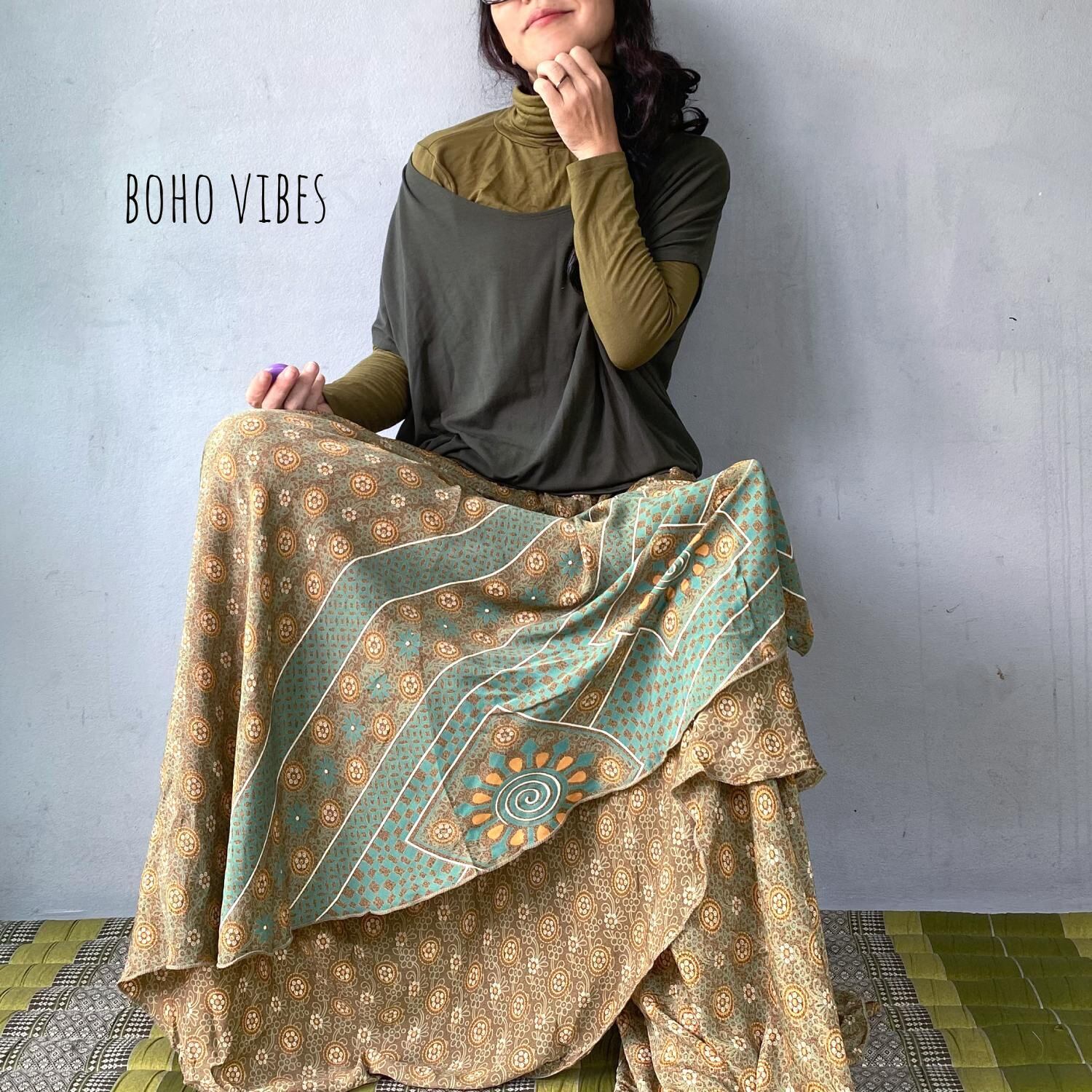 インドの伝統的なサリー生地をリメイクした、一点もののSUPERフレアスカートパンツが登場しました。フレアスカート風のデザインで、歩く度に優雅な柄がチラリと見えるエレガントな仕上がり。シルクのような上質な生地で、触れるたびに心地よい肌触りを感じることができます。