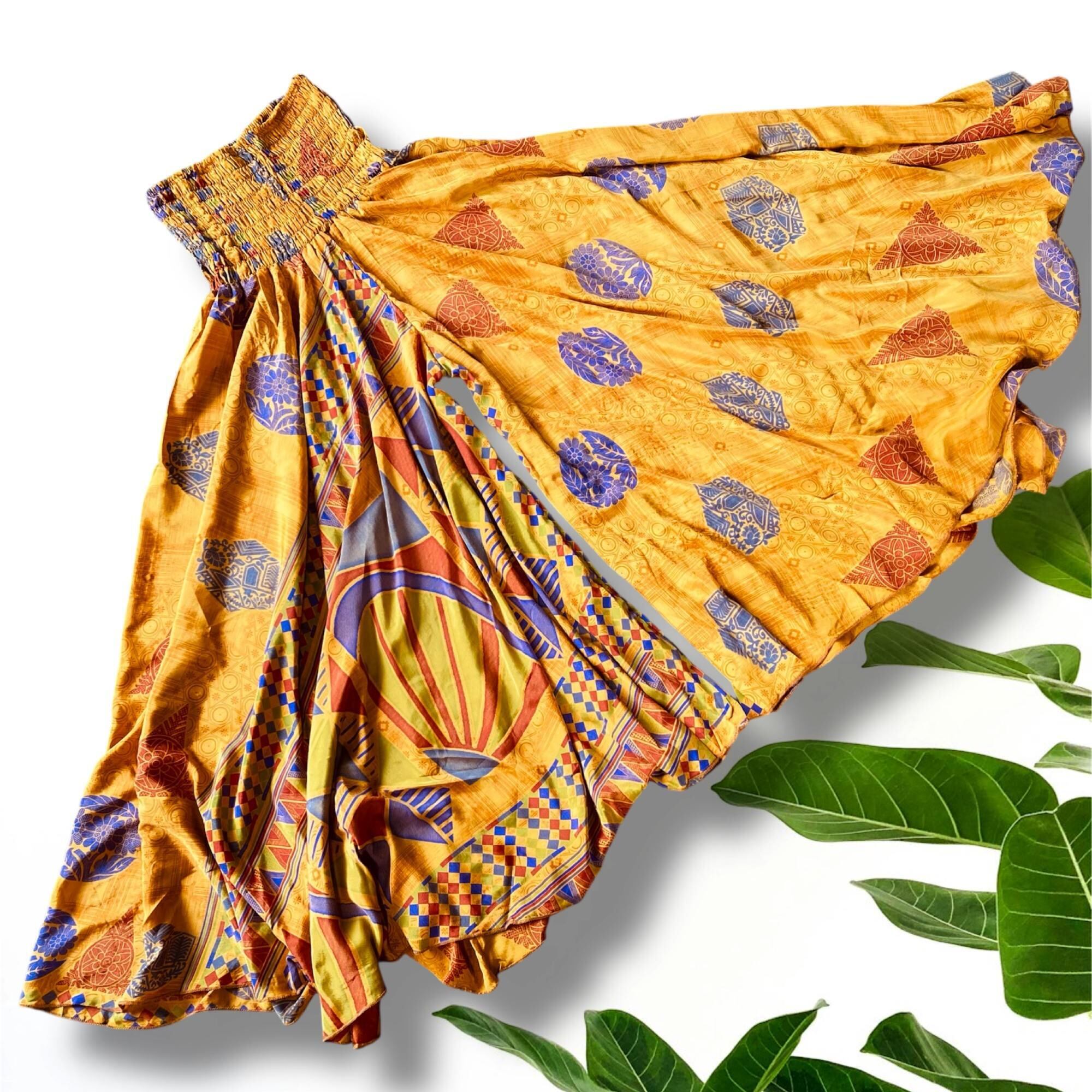 インドの伝統的なサリー生地をリメイクした、一点もののSUPERフレアスカートパンツが登場しました。フレアスカート風のデザインで、歩く度に優雅な柄がチラリと見えるエレガントな仕上がり。シルクのような上質な生地で、触れるたびに心地よい肌触りを感じることができます。