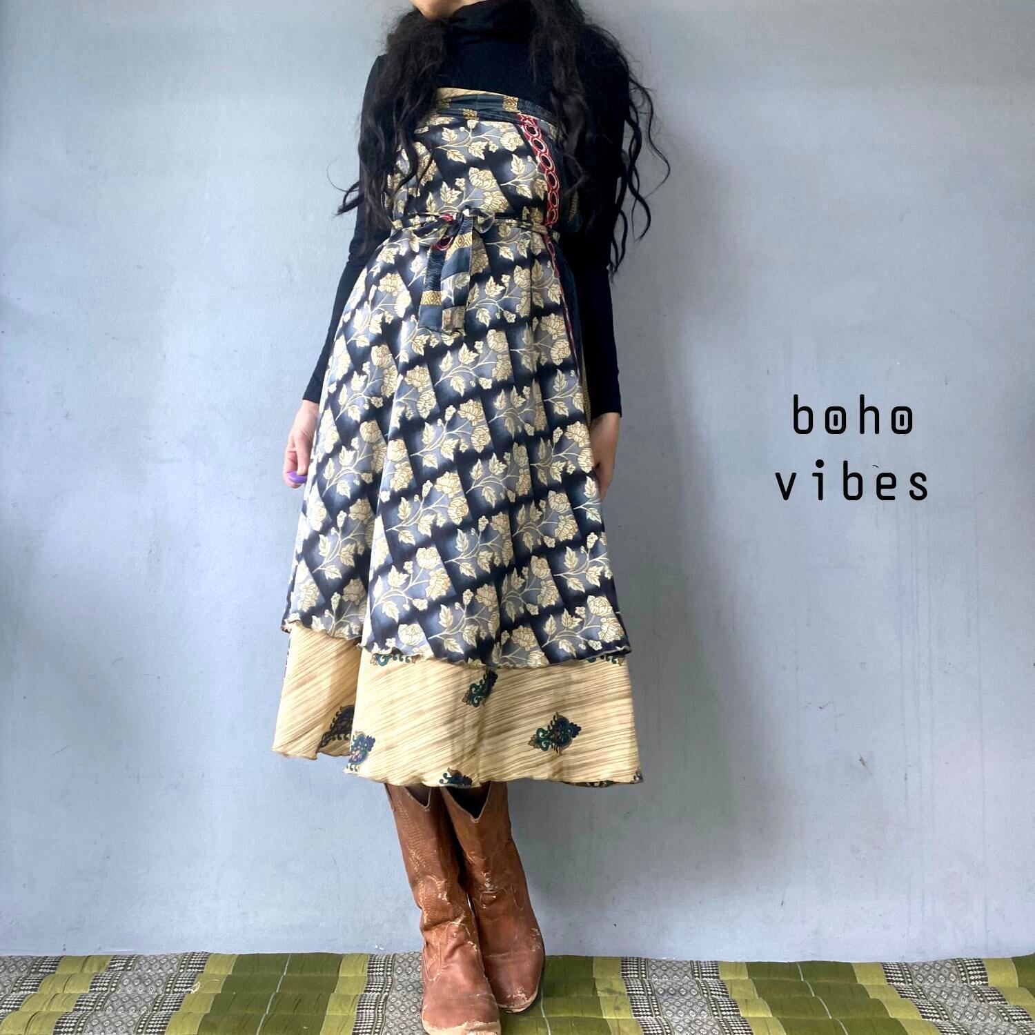 この巻きスカートは、サリーの魅力を活かしつつ、簡単に着脱ができるデザイン。巻き方次第ではワンピースやジレとしても活用できるので、コーディネートの幅が広がります。様々なシーンで活躍し、あなたのスタイルを引き立てます。