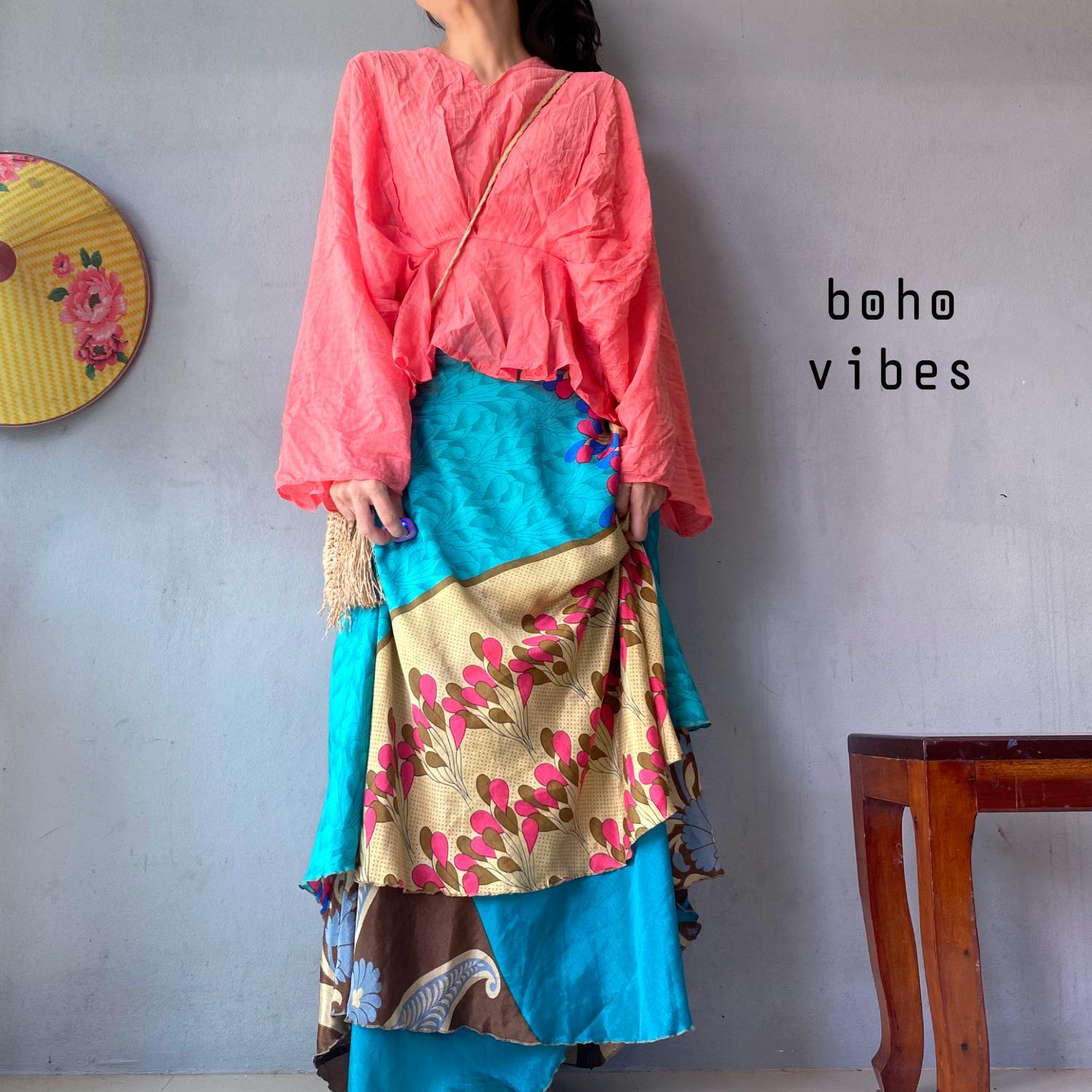 美しいインドの伝統が息づく、オールドサリーをリメイクした巻きスカートが登場しました!一枚ずつセレクトされたサリーから作られたこのスカートは、実に個性的で、他にはない唯一無二のアイテムです。