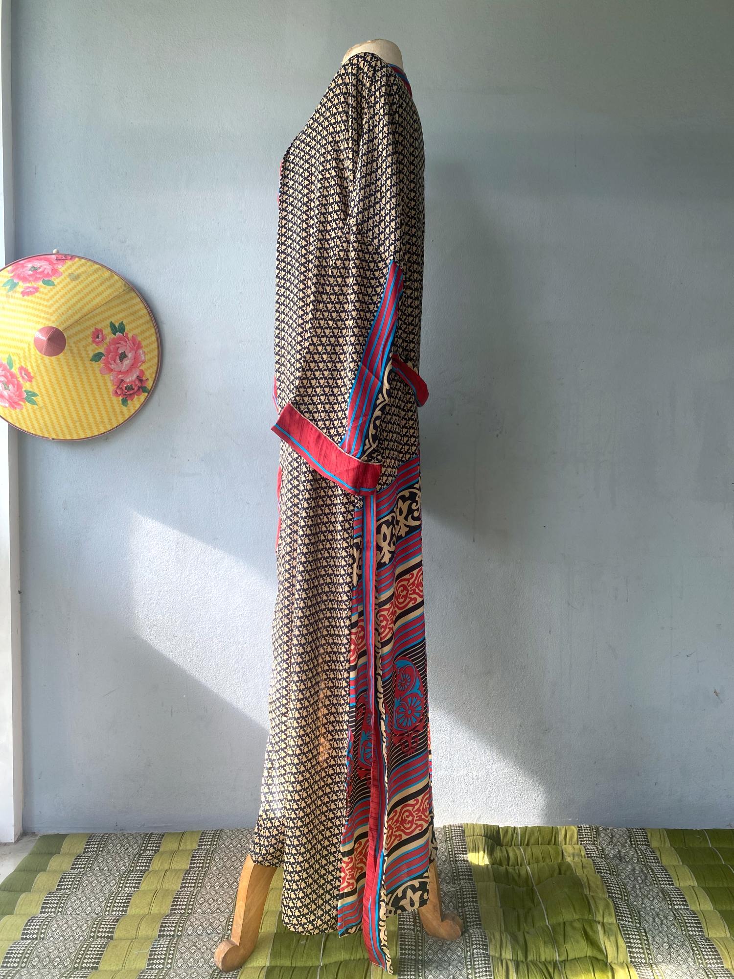 このボヘミアンKimonoは、一点もののため他と差をつけたい方におすすめです。独創的なスタイリングを楽しみたい方や、ファッションにアートを取り入れたい方にぴったりのアイテムです。ロング丈の羽織りカーディガンなので、体型をカバーしつつ、スタイリッシュな印象を与えてくれます。