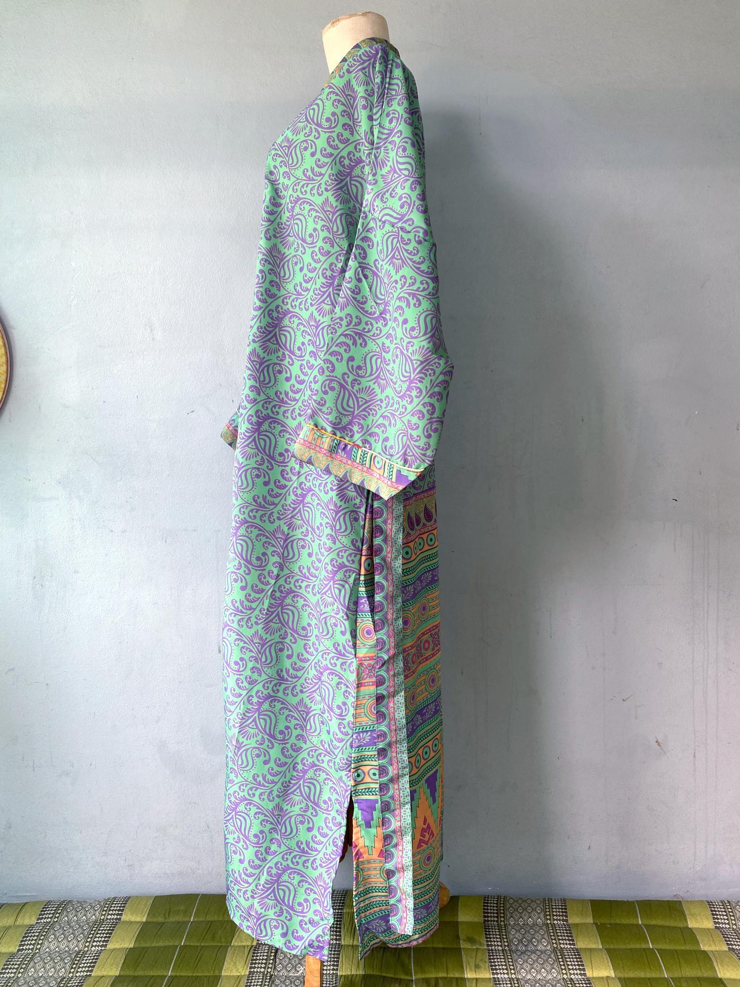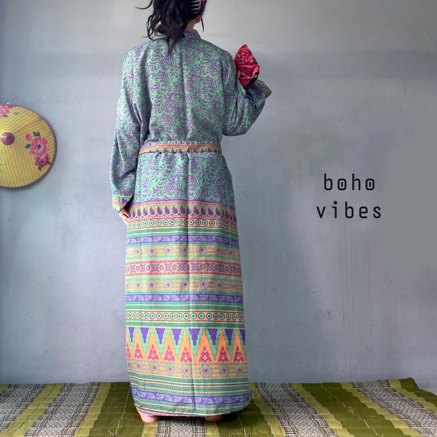 カジュアルな普段使いから、パーティーやイベントなどの華やかなシーンまで幅広く活躍してくれます。着こなし次第で、どんな場面にもマッチする汎用性の高さも魅力の一つです。また、インドサリーのパワーとボヘミアンの自由な精神が融合したデザインは、着るだけで心が解放されるような気持ちにさせてくれます。