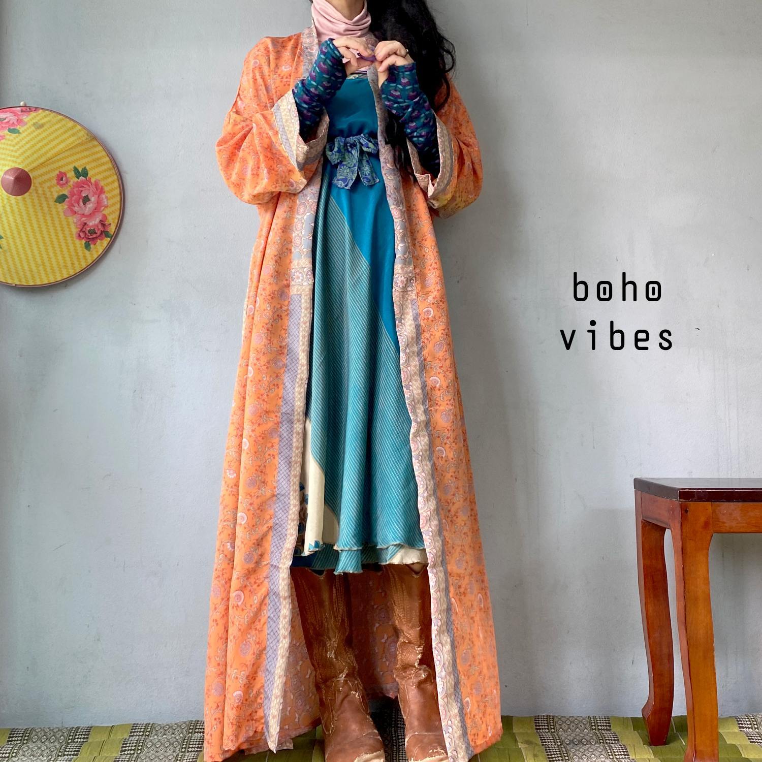 この巻きスカートは、サリーの魅力を活かしつつ、簡単に着脱ができるデザイン。巻き方次第ではワンピースやジレとしても活用できるので、コーディネートの幅が広がります。様々なシーンで活躍し、あなたのスタイルを引き立てます。