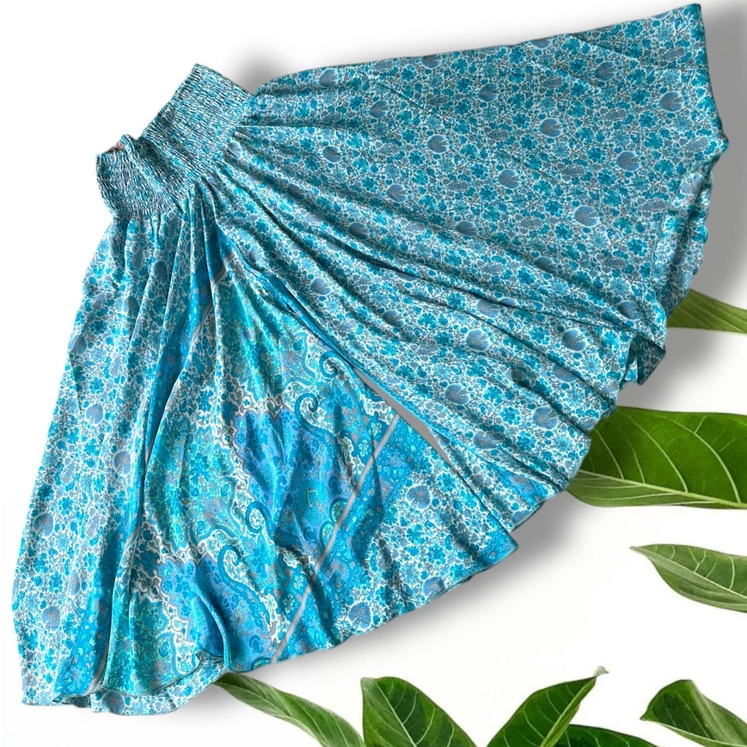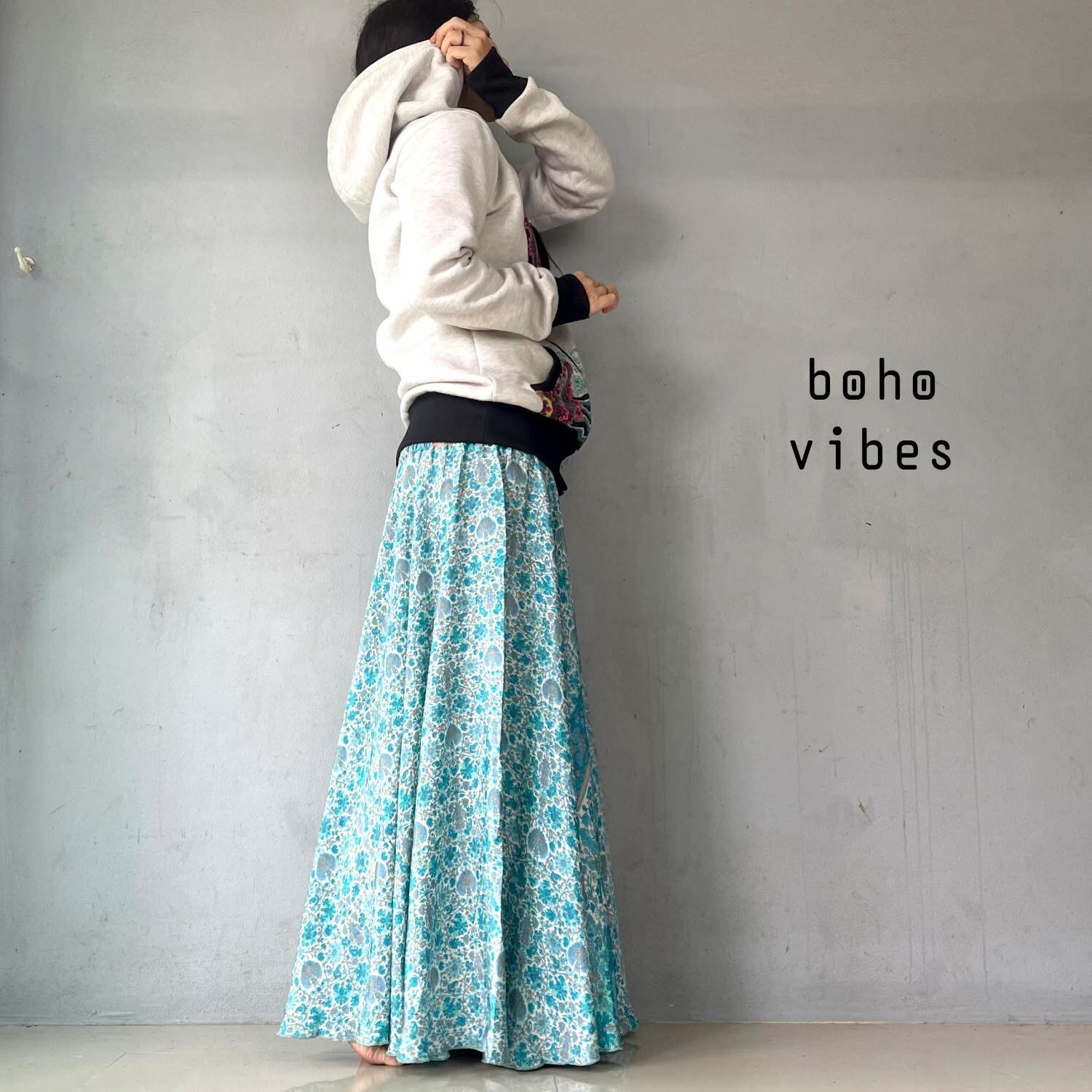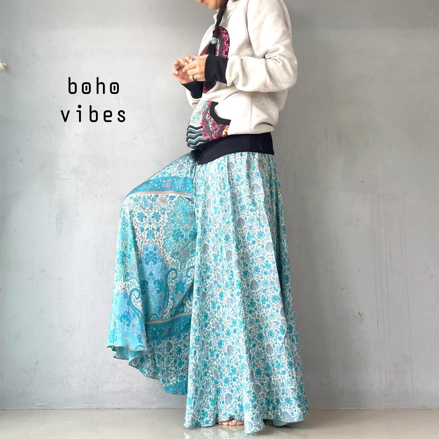 インドの伝統的なサリー生地をリメイクした、一点もののSUPERフレアスカートパンツが登場しました。フレアスカート風のデザインで、歩く度に優雅な柄がチラリと見えるエレガントな仕上がり。シルクのような上質な生地で、触れるたびに心地よい肌触りを感じることができます。