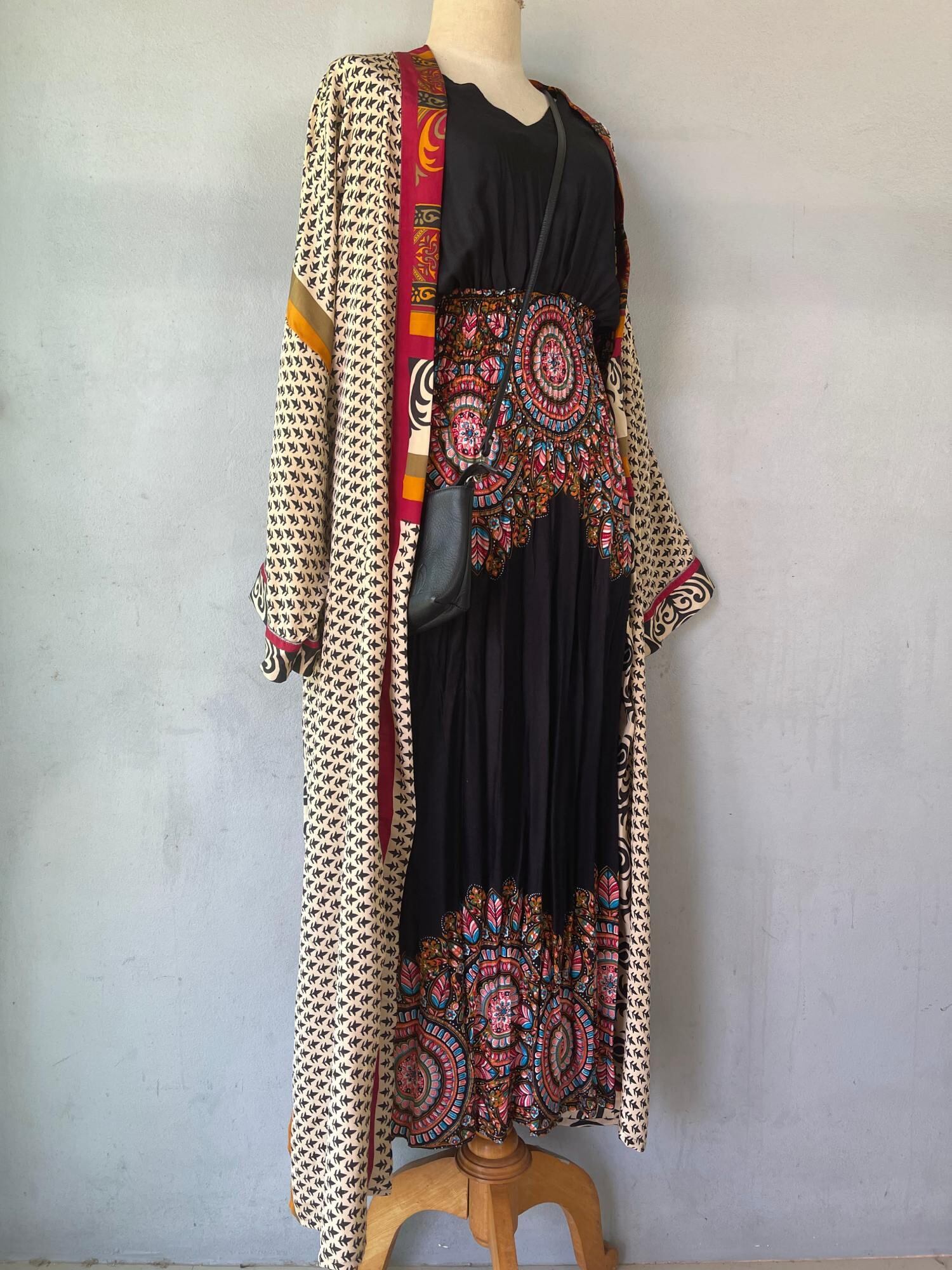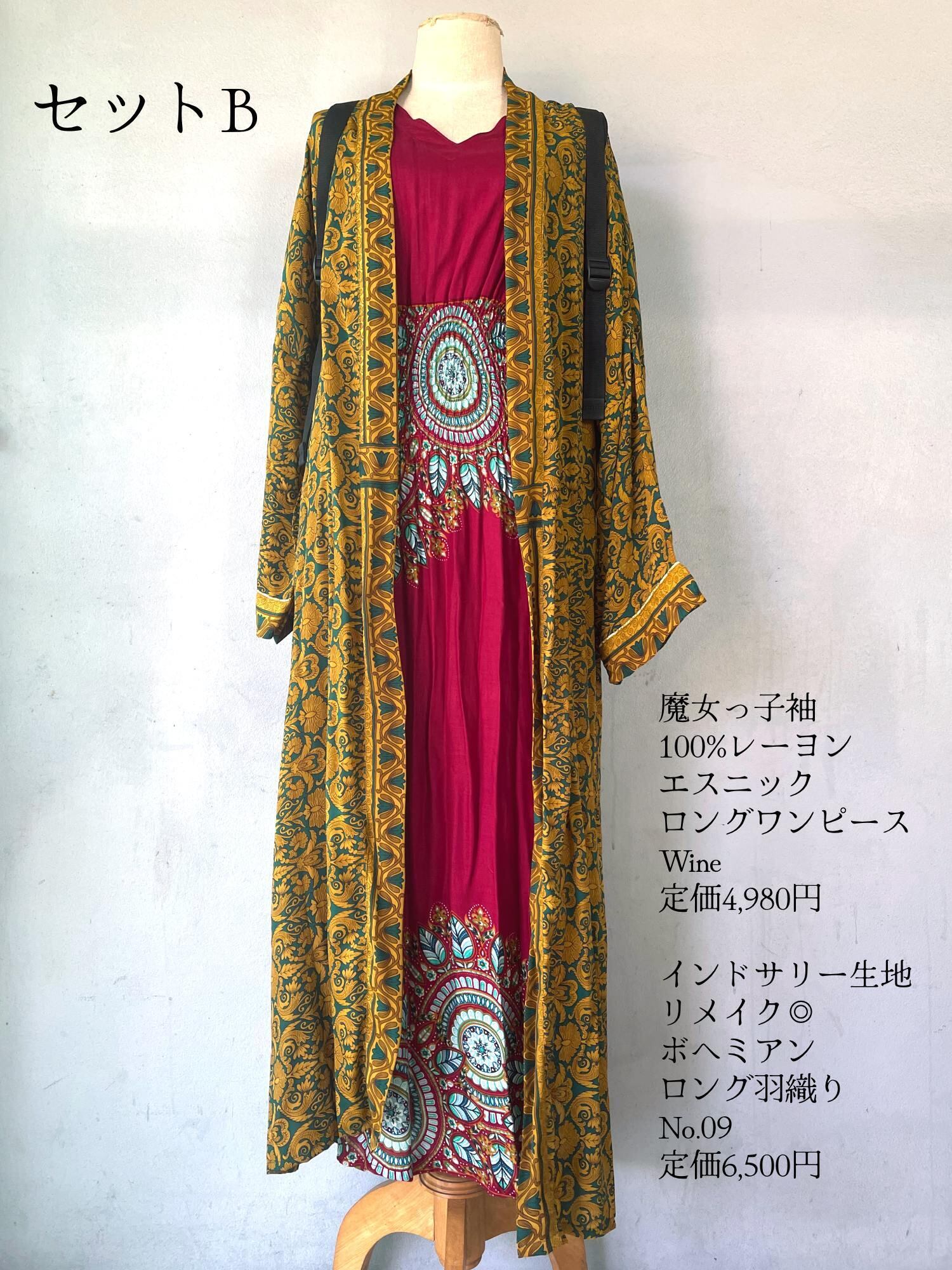 三角のひらり袖がエキゾチックなエスニックワンピースと、インドサリーをリメイクしたロング丈の羽織りに2点セットです。