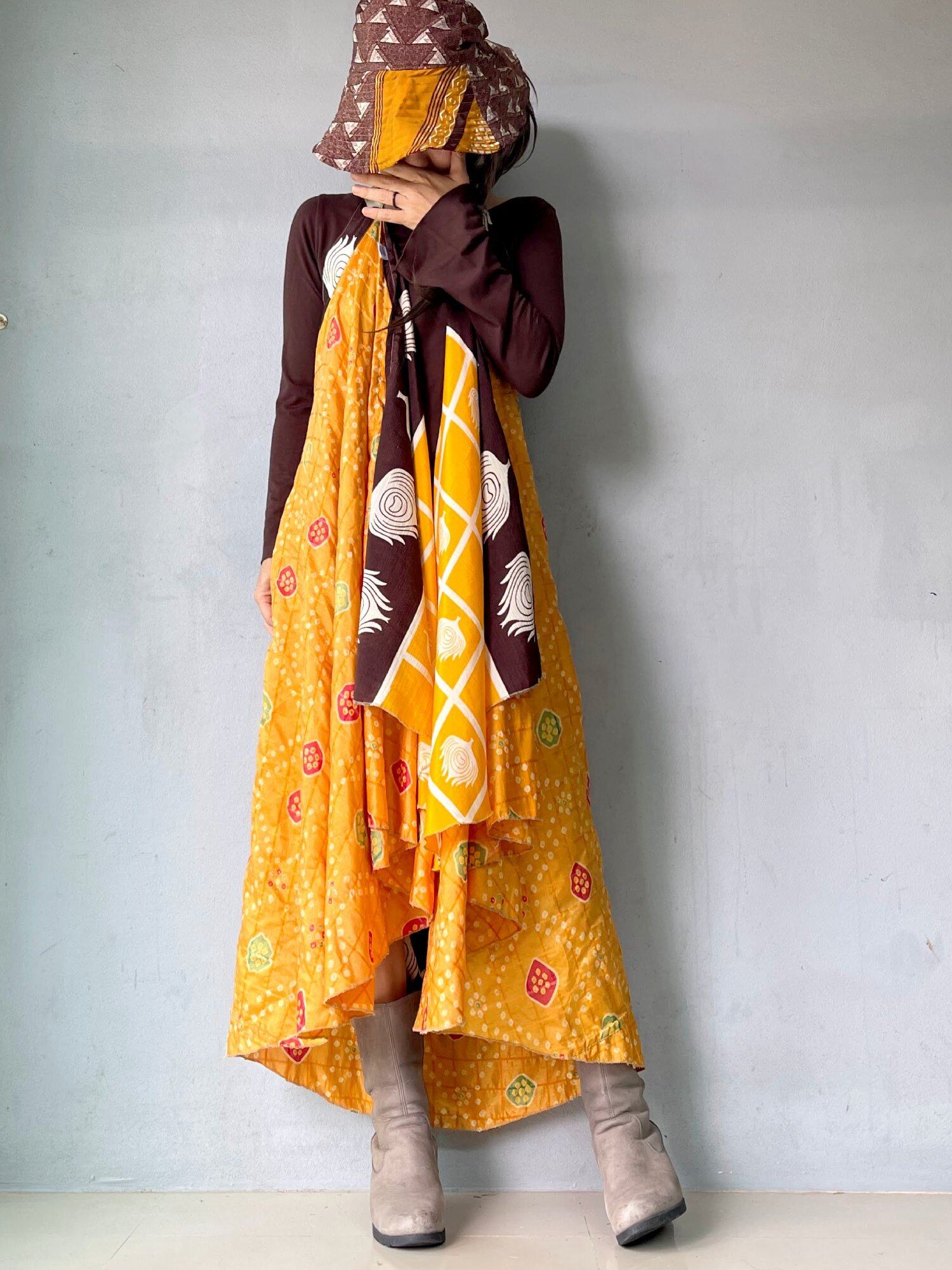 この巻きスカートは、サリーの魅力を活かしつつ、簡単に着脱ができるデザイン。巻き方次第ではワンピースやジレとしても活用できるので、コーディネートの幅が広がります。様々なシーンで活躍し、あなたのスタイルを引き立てます。