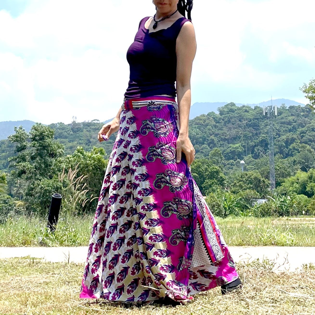 この巻きスカートは、サリーの魅力を活かしつつ、簡単に着脱ができるデザイン。巻き方次第ではワンピースやジレとしても活用できるので、コーディネートの幅が広がります。様々なシーンで活躍し、あなたのスタイルを引き立てます。